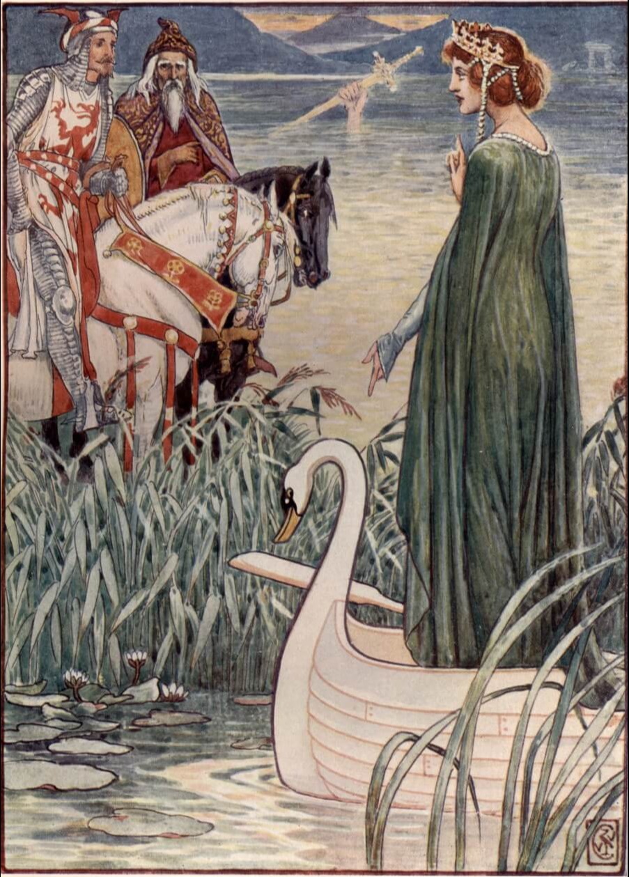 "King Arthur asks the Lady of the Lake for the sword Excalibur." by Walter Crane