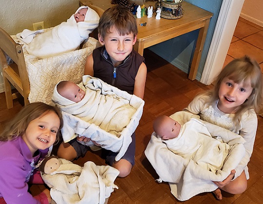 First the Wise Men came, then the shepherds. In fact, one of the Wise Men couldn’t make it so he passed a gift on with the other Wise Man. Dress up clothing needn’t be expensive. I was Joseph and I was dressed up in the coarse striped blanket that sits on our couch! Of course “Mary” had a headcover and a doll wrapped up in a neutral colored blanket, making sure to cover the doll's clothes that might give away that this was not a birth from 2,000 years ago! The presents ranged from boxes of yellow toys (gold) to every toy on the shelf (the Wise Men had sisters that also wanted to give presents). No worries, once you’ve been one character, just swap roles (and blankets) and try out another persona.